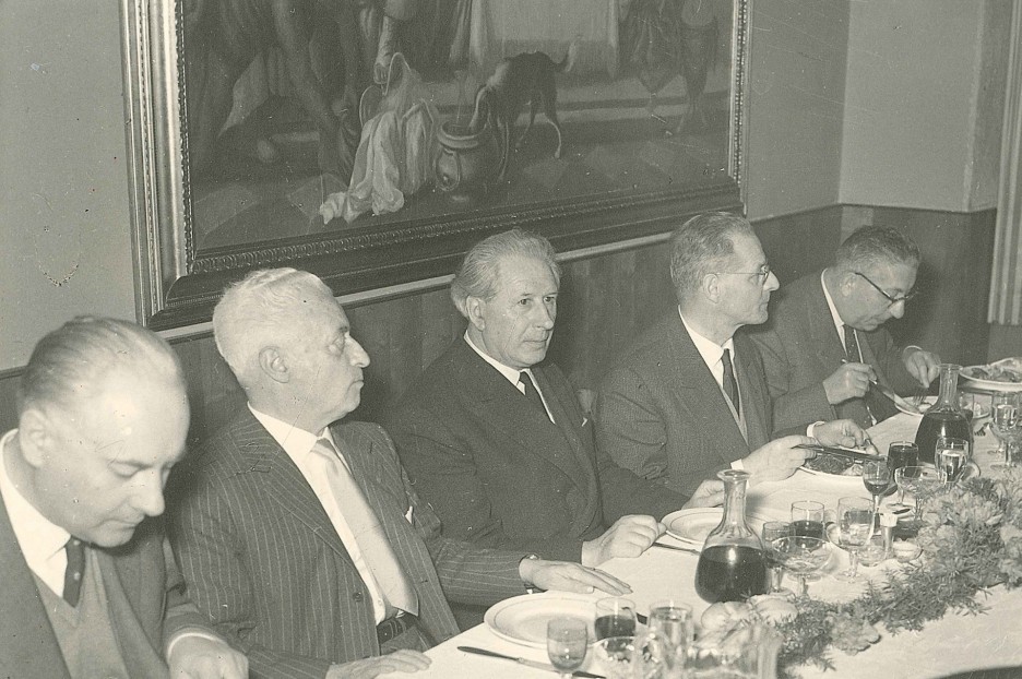 Aprile 1960. Da sinistra: dott. Ladislao Laszloczky, Ispettore Generale della Cassa di Risparmio, rag. Enzo Fossi, Direttore Generale, rag. Casagranda, Ragioniere Capo, avv. Cesare Degara, Segretario Generale, dott. Gaetano Salvaneschi, Capo Ufficio Personale