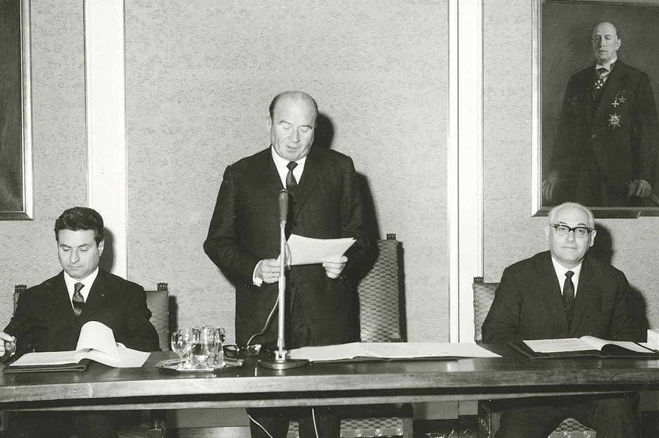 14.11.1968. In piedi il Presidente, avv. Brandstätter con il Vice Presidente, dott. Giulini ed il Direttore Generale, dott. Laszloczky